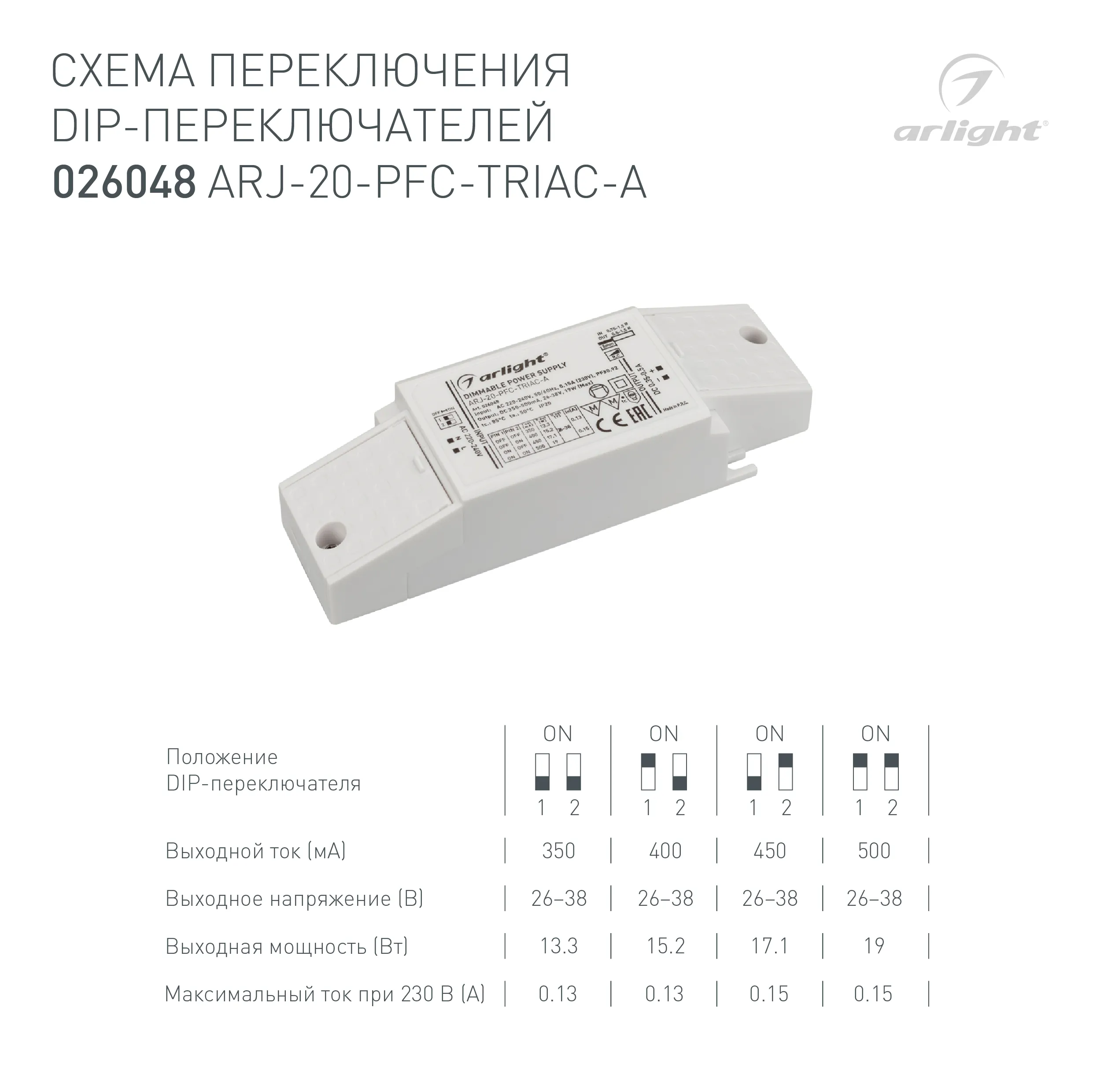 Блок питания ARJ-20-PFC-TRIAC-A (20W, 350-500mA) (Arlight, IP20 Пластик, 5 лет)