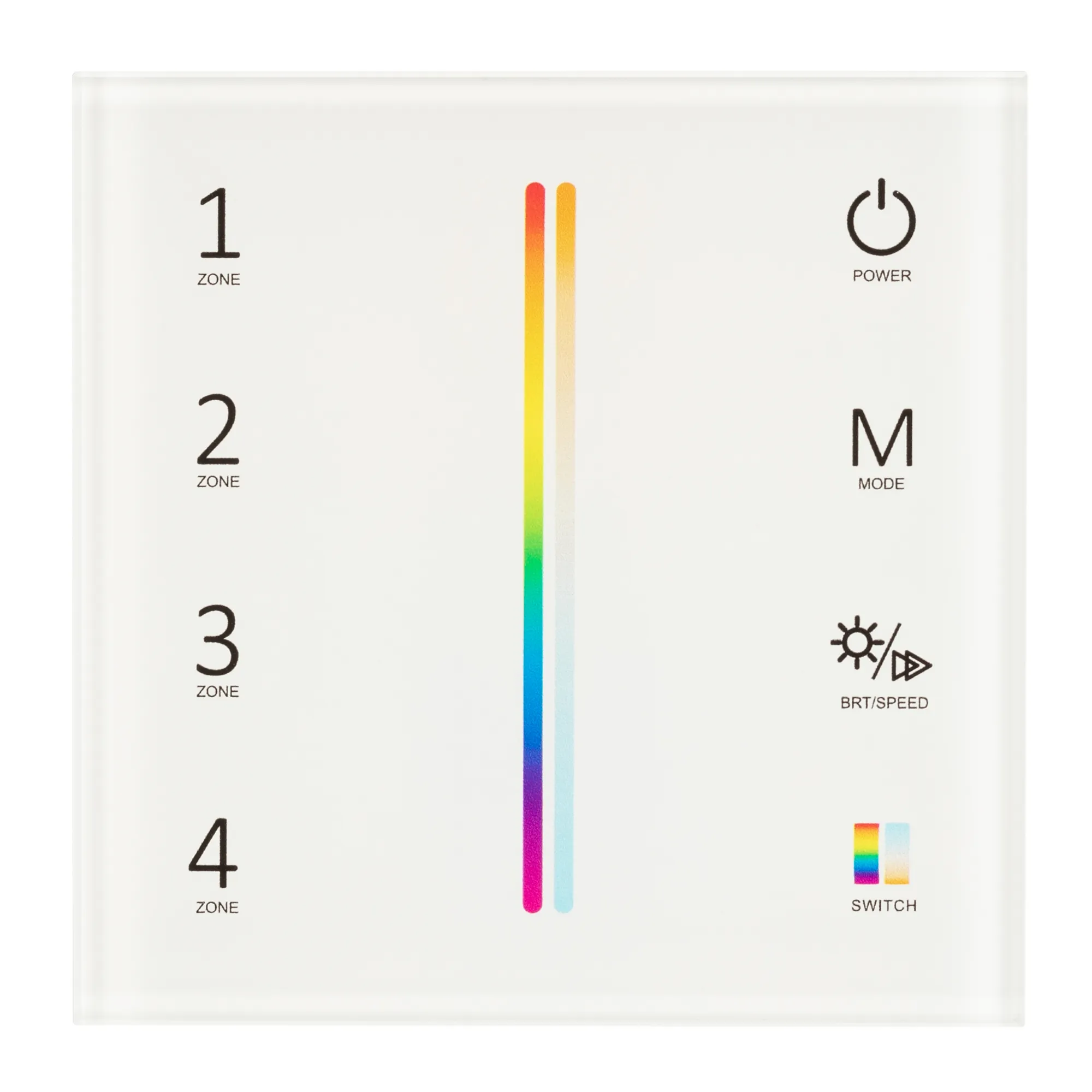 Накладная сенсорная панель 2.4 ГГц, цвет белый. Материал - стекло. Для управления RGB+MIX (5-канальными) источниками света (ШИМ), 4 зоны управления. Питание/рабочее напряжение 3VDC от 2xAAA. Габариты 86х86х21 мм. Панель совместима с контроллерами серии SMART.