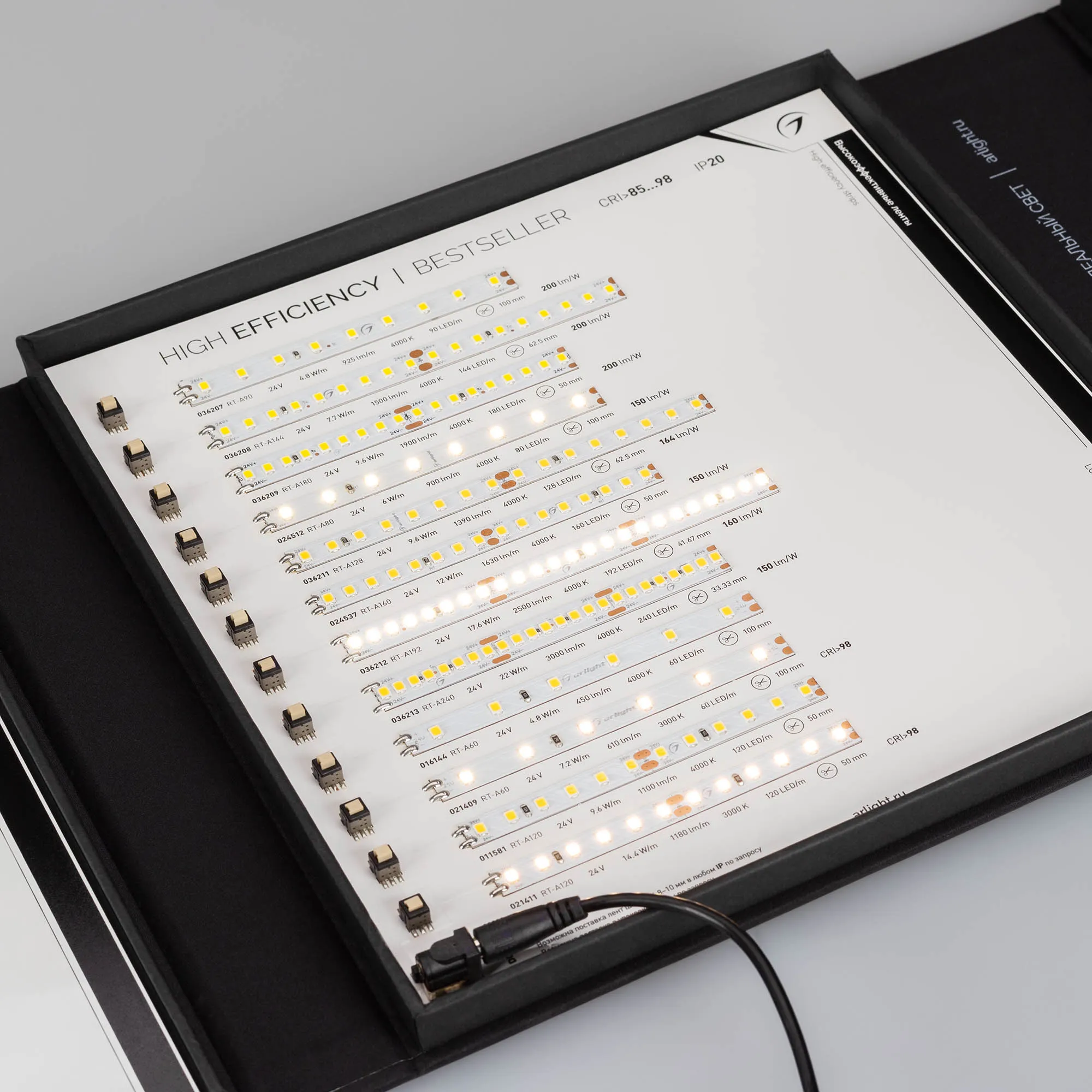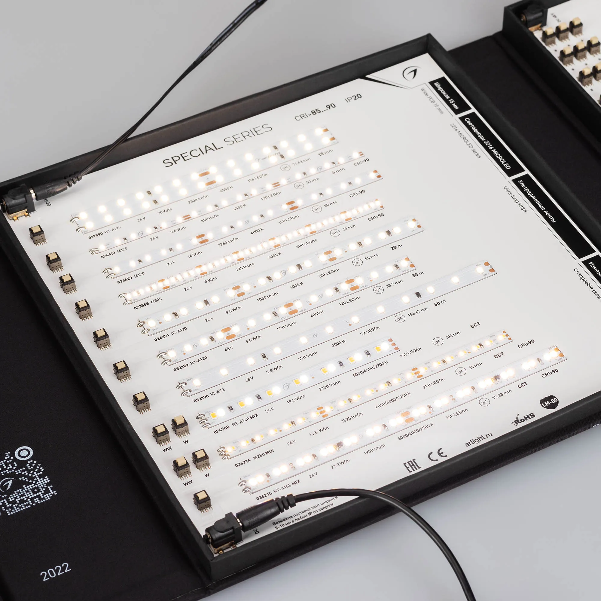 В кейс входят 42 образца моделей лент COB, RT, MICROLED, IC, MIX, SPI, DMX.