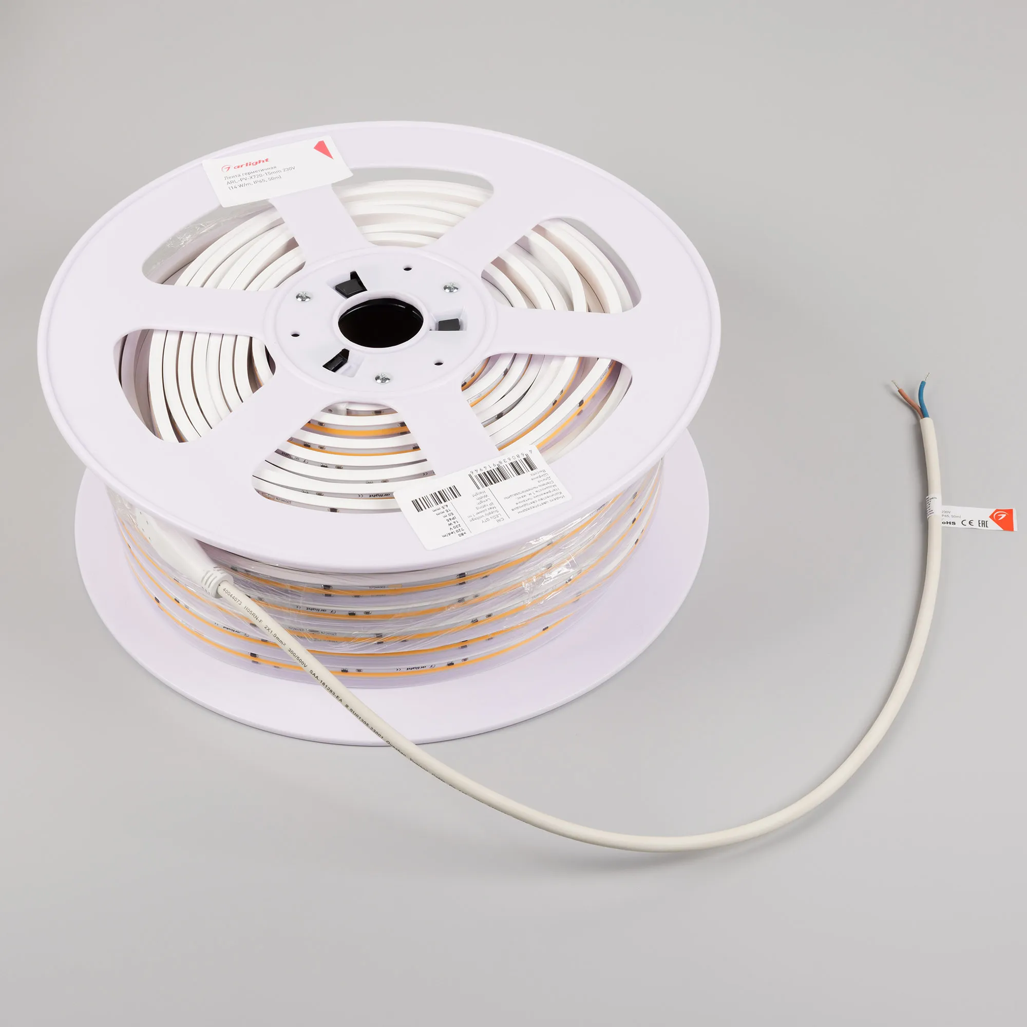 Светодиодная герметичная лента ARL сплошного свечения серии X720, IP65 (PV - трубка ПВХ экструзия). Светодиоды CSP, 720 шт/м, белая плата шириной 12 мм, крепление на силиконовые скобы (скотч 3M отсутствует). Цвет ТЕПЛЫЙ 2700K, индекс цветопередачи CRI>80, угол 180°. Питание 230 В, мощность 14 Вт/м (700 Вт на 50 м). Размеры 50000x15x6.5 мм. Мин. отрезок 250 мм, 180 светодиодов. Цена за 1 м.