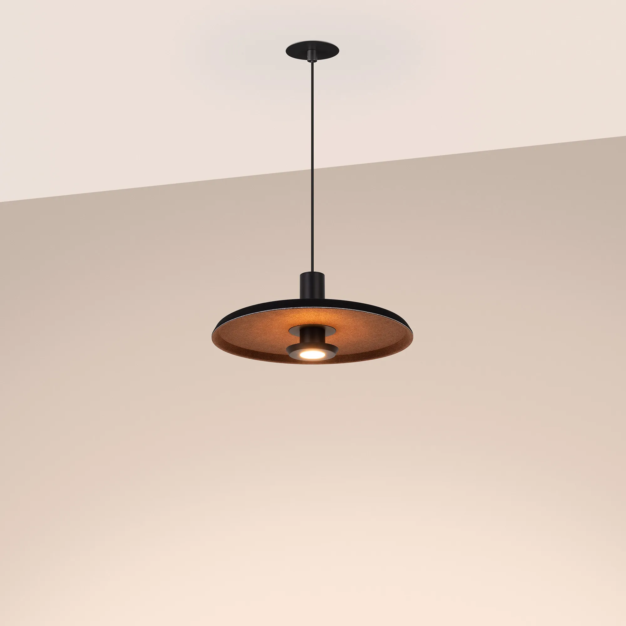 Подвесной светильник. Мощность 12 Вт, св. поток 597 лм, 49 лм/Вт, теплый 2700 K, CRI>94, угол 36°, напряжение питания 230 В. Черный фигурный корпус из переработанного фетра с внутренней поверхностью цвета мокко, линза-рассеиватель из PMMA, степень защиты IP20. Размер: диаметр 350 мм, высота 145 мм. Монтаж подвесной, длина подвеса 2000 мм, регулируемая. В комплекте 2 вида чаш. Габариты чаши (встраиваемая) Ø80 х 23 мм, врезное отверстие Ø60 мм. Габариты чаши (накладная) Ø120 x 35 мм. Драйвер 59 В, 300 мА, пульсация <1%. Управление по TRIAC.